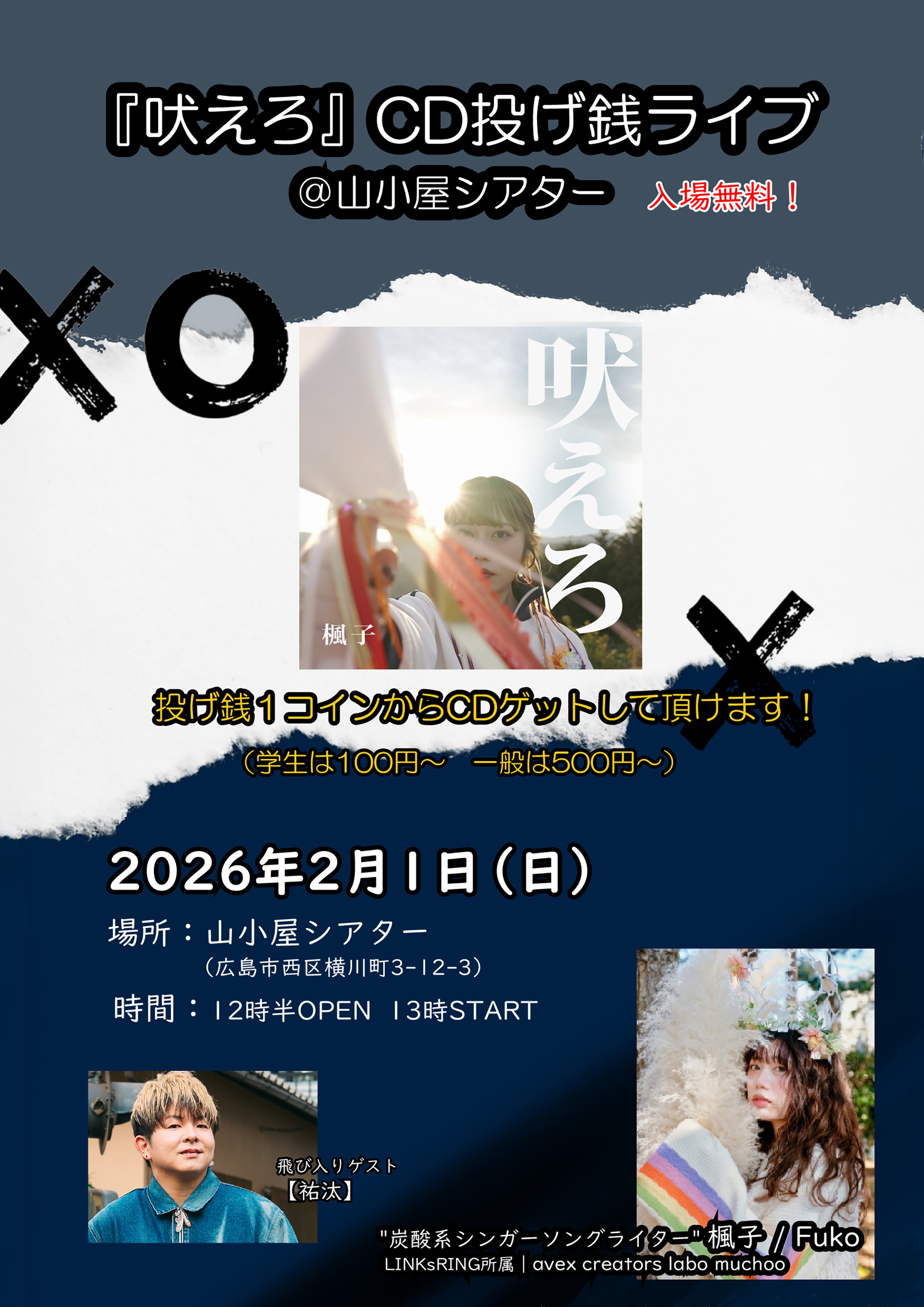 2025年2月1日(日)場所:山小屋シアター(広島市西区横川町3-12-3)時間:12時半OPEN 13時START※飛び入り参加で【祐汰】さんが盛り上げにきてくれることになりました!※フリーライブですのでチケットやドリンクなどの費用は発生しません。