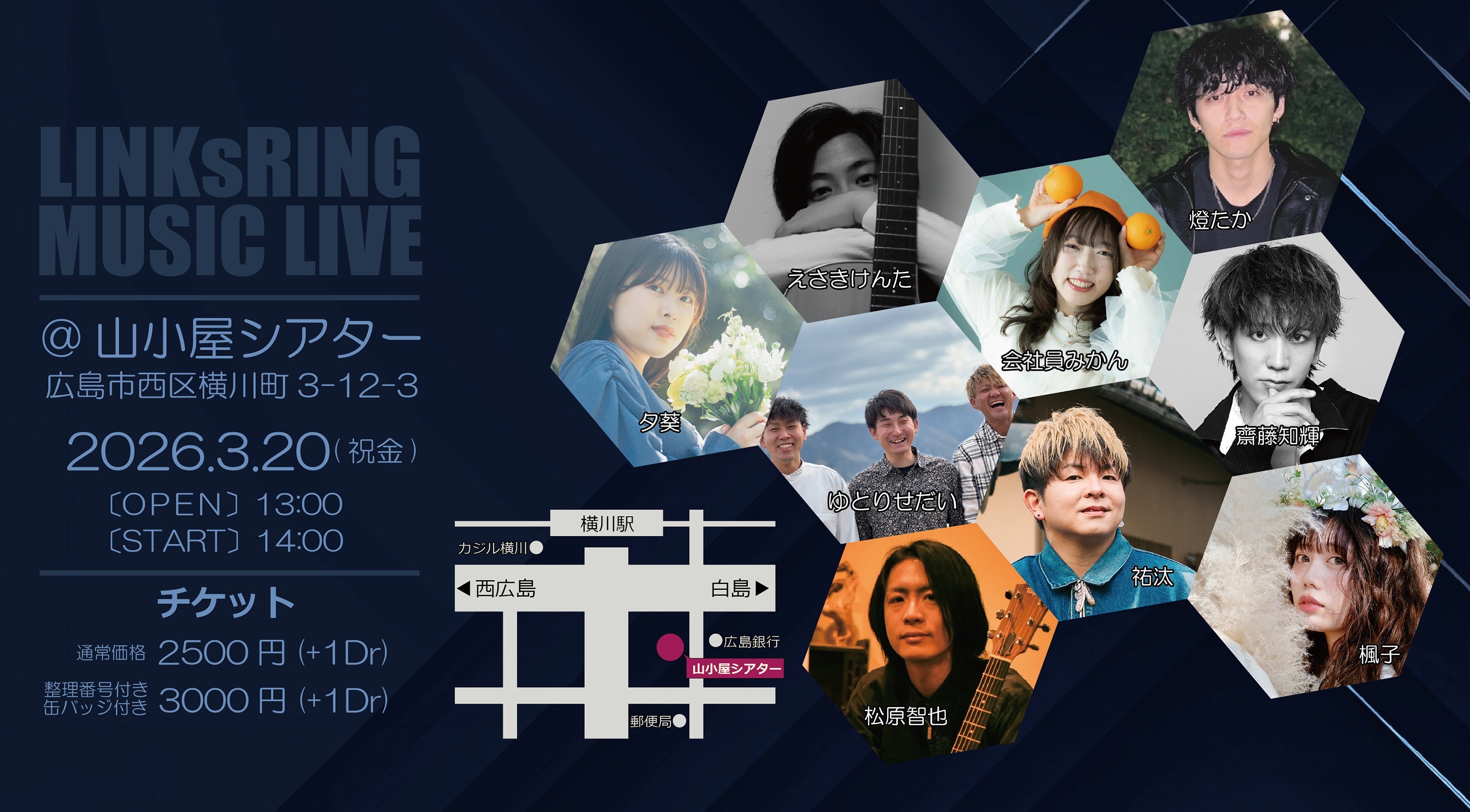 2026年3月20日(祝金)LINKsRING MUSIC LIVE〔OPEN〕13:00 〔START〕14:00場所:山小屋シアター(広島市西区横川町3-12-3)チケット:通常価格2500円(別途1ドリンク)整理番号付3000円(別途1ドリンク)