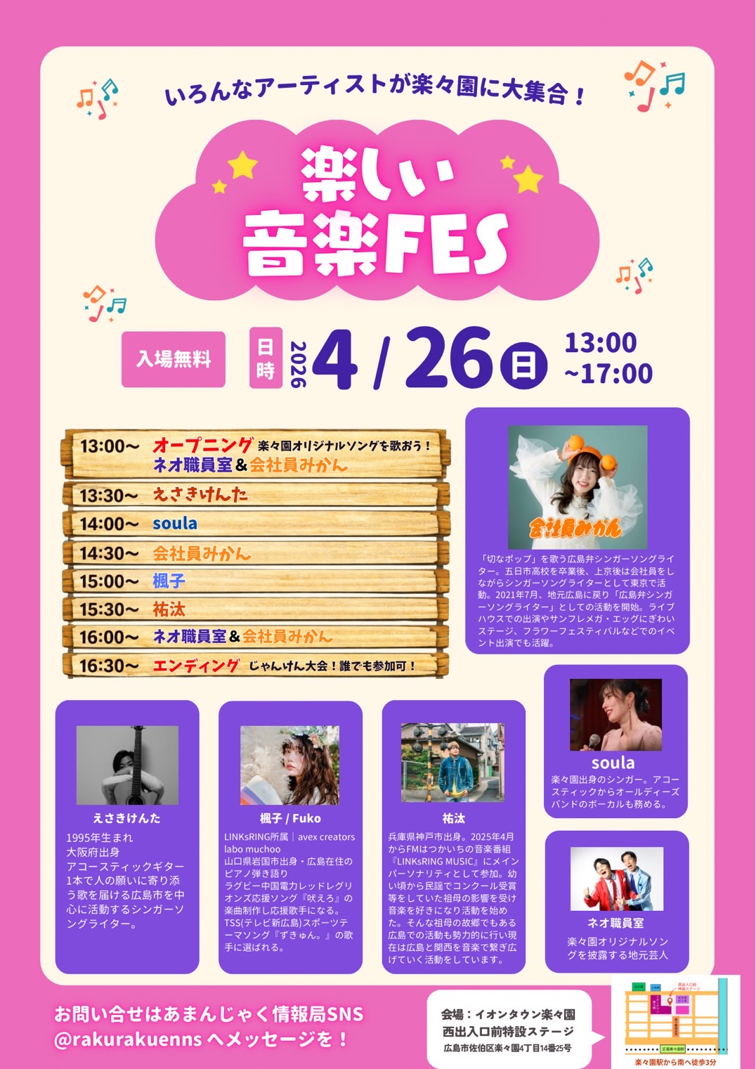 2026年4月26日(日)時間 13:00-17:00場所 イオンタウン楽々園[西出口前特設ステージ]広島市佐伯区楽々園4丁目14番25号